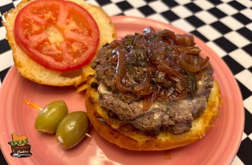 I poached this recipe for delicious onion jam from Grady Spears’ Cowboy Cocktails book. It’s a combination of sweet and tangy. You will need a good-size pot for this, and I’d wager that most of you can do just fine making half the recipe. We made onion marmalade for our Blue Cheese Burgers recipe. It also works great on other burger recipes, as well as on chicken.
